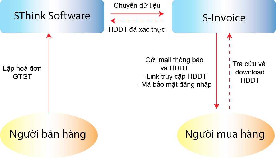 – Hoá đơn được người bán hàng lập trên phần mềm kế toán SThink. Phần mềm kế toán SThink kết nối phần mềm hoá đơn điện tử bên Viettel, ký số sau đó gửi lên cơ quan thuế để xác thực, cơ quan thuế trả về thông tin hóa đơn điện tử có mã xác thực cho doanh nghiệp và tự động gởi mail đến khách hàng.