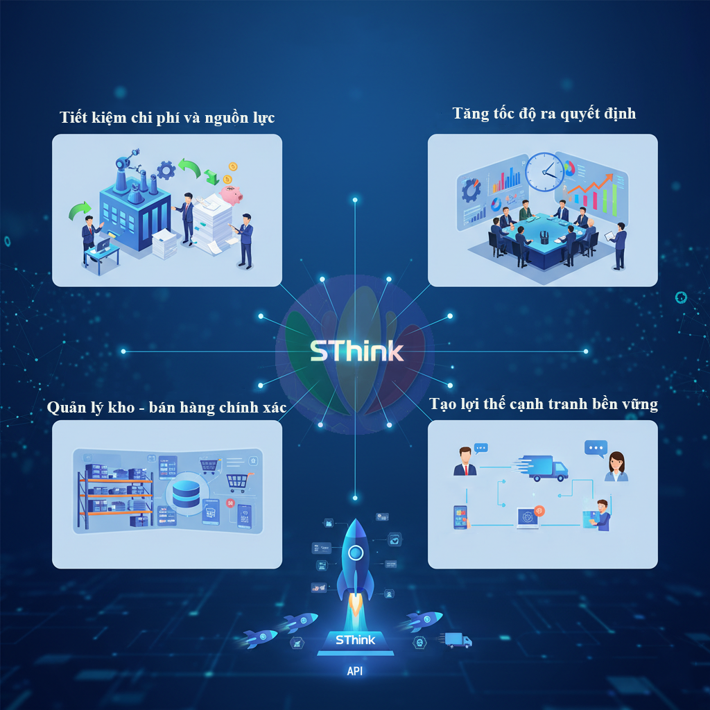 Trong thời đại số, phần mềm SThink với việc kết nối API chính là “chìa khóa vàng” để doanh nghiệp Việt tháo gỡ mọi khó khăn trong quản trị, từ dữ liệu rời rạc đến việc mở rộng thị trường. Không chỉ dừng lại ở quản lý, SThink còn mang đến giá trị chiến lược: giúp doanh nghiệp tiết kiệm chi phí, tăng tốc ra quyết định, cải thiện trải nghiệm khách hàng và nâng cao lợi thế cạnh tranh.